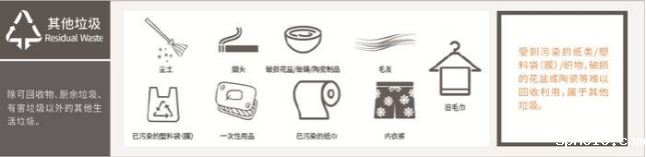 表示除可回收物、有害垃圾、厨余垃圾外的生活垃圾。大多数家用卫生品以及复合型的,由多种材质、部件组成却难以拆解的产品,比如打火机、笔、伞等。